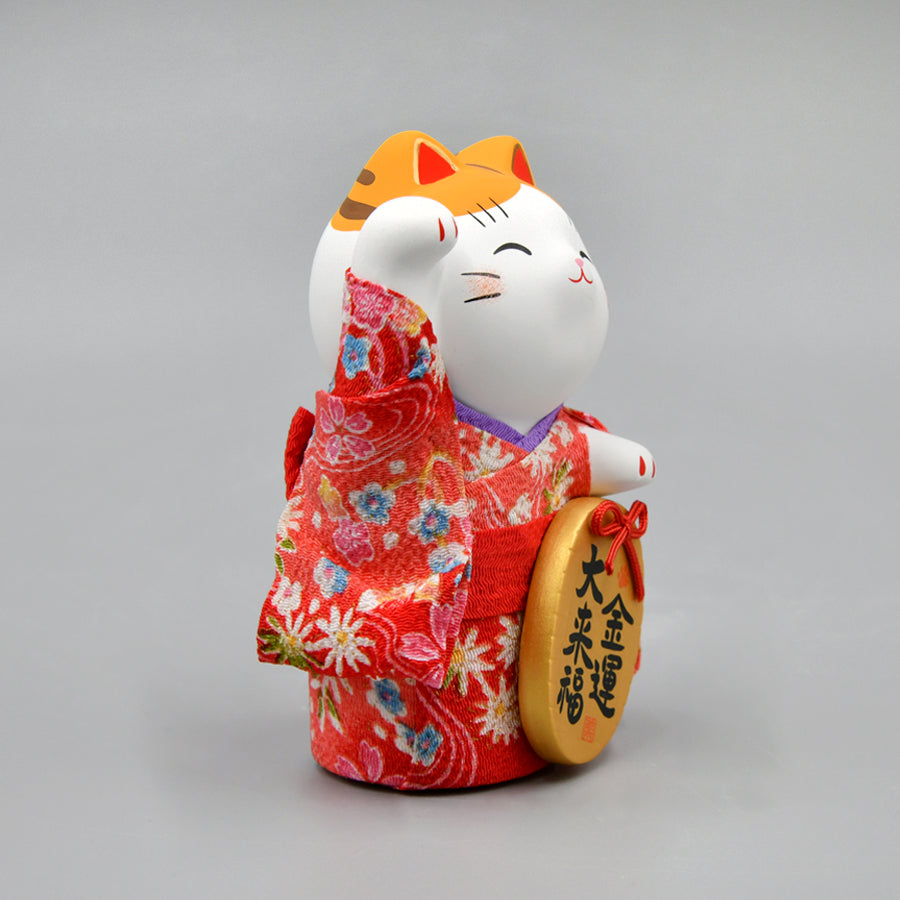 江戸時代から日本の着物の素材として愛されてきた「ちりめん」は、細やかな「しぼ」と呼ばれる凹凸が特徴の織物です。伝統柄はもちろん、「薬師窯(やくしがま)」オリジナルの柄で美しいちりめんを纏った招き猫は、カラフルな色使いで周囲を華やかにするだけではなく、心をほっとさせる癒しの効果も。日本らしさが満載の招き猫は、海外の人たちにも人気が高く、お土産としてもとても喜ばれています。