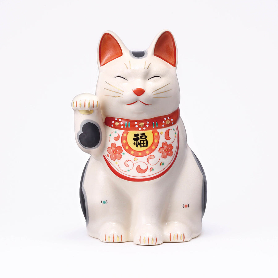 その生命力の強さから「唐草」は子孫繁栄を意味し、焼き物の世界でも昔から多用されてきた縁起のよい模様です。この唐草模様をよだれ掛けにあしらった招き猫は、より本物の猫に近い表情をしていることから猫好きの方に好まれています。また、右手、左手をそれぞれ掲げた招き猫をペアで購入できるギフトセットもご用意していますので、結婚祝いを始め、金婚式や銀婚式など、ご夫婦の記念日に贈るギフトとして人気があります。