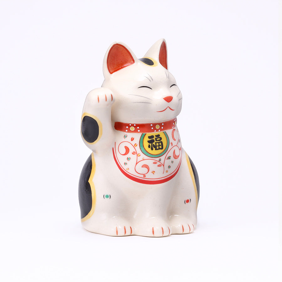 その生命力の強さから「唐草」は子孫繁栄を意味し、焼き物の世界でも昔から多用されてきた縁起のよい模様です。この唐草模様をよだれ掛けにあしらった招き猫は、より本物の猫に近い表情をしていることから猫好きの方に好まれています。また、右手、左手をそれぞれ掲げた招き猫をペアで購入できるギフトセットもご用意していますので、結婚祝いを始め、金婚式や銀婚式など、ご夫婦の記念日に贈るギフトとして人気があります。
