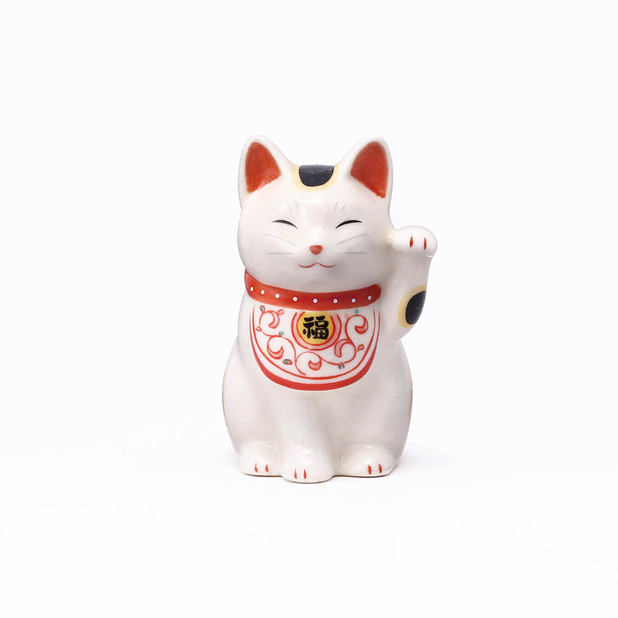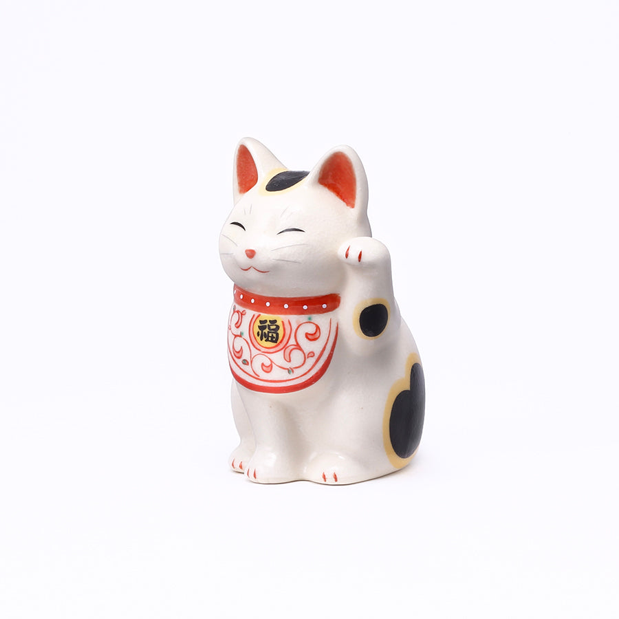 その生命力の強さから「唐草」は子孫繁栄を意味し、焼き物の世界でも昔から多用されてきた縁起のよい模様です。この唐草模様をよだれ掛けにあしらった招き猫は、より本物の猫に近い表情をしていることから猫好きの方に好まれています。また、右手、左手をそれぞれ掲げた招き猫をペアで購入できるギフトセットもご用意していますので、結婚祝いを始め、金婚式や銀婚式など、ご夫婦の記念日に贈るギフトとして人気があります。