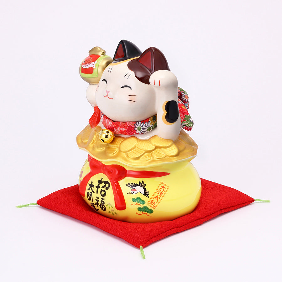 「打ち出の小槌」は、欲しいものや願いごとを唱えて振るとその願いどおりのご利益が得られるといわれています。本来は大黒天様の持ち物ですが、招き猫が持つことでよりたくさんの幸をもたらしてほしいという願いを込めて作りました。お金を招くといわれる右手だけではなく、左手には願いを叶える打ち出の小槌を持ち、開運に向けてパワーアップした招き猫は、人生の節目となる記念日や新築のお祝いなどにおすすめです。