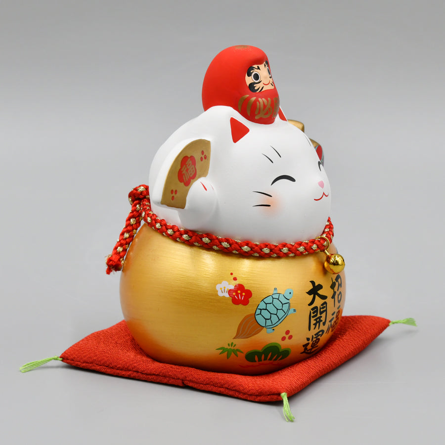 「だるま」と称してはいるものの、だるまになりきれず、ひょうたんの形をしたユニークな招き猫です。縁起物として親しまれてきただるまの「七転び八起き」「不撓不屈」の精神はそのままに、さらなる福を招こうと小さな手を懸命に掲げています。それを応援するかのように、招き猫の頭の上には小さなだるまがちょこんと鎮座し、なんとも縁起のよい招き猫になっています。試験などの合格祈願などに贈ったら、きっと喜ばれることでしょう。