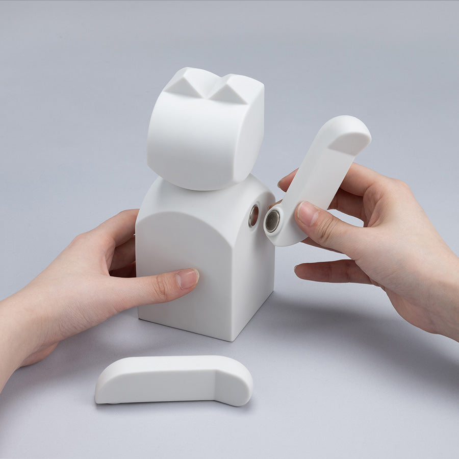 頭と胴体、腕にマグネットを装着することにより、願いやお好みにあわせて各部位を簡単に組み換えることができる招き猫です。