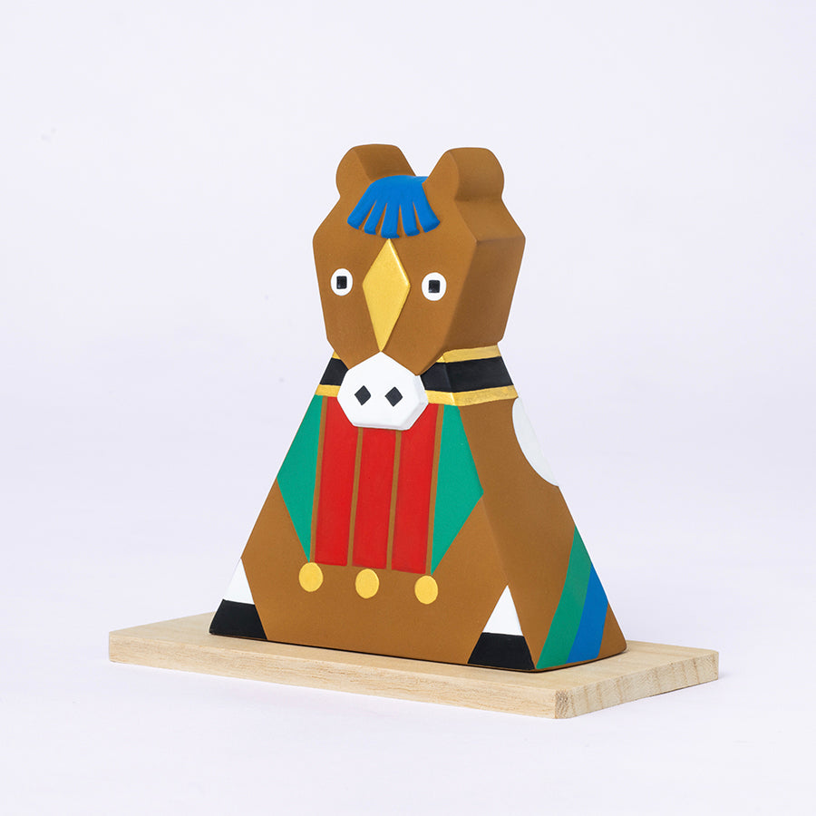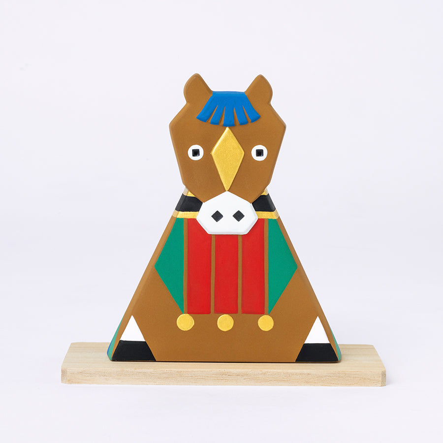 新たに加わる「十二支飾り・午」は、これまでに発表した干支と調和しながらも、それぞれの個性が引き立つよう配色にもこだわりました。穏やかで優しい印象の茶色をメインカラーに、2026年の「丙午(ひのえうま)」にちなんで芯の通った情熱の赤を中央に配し、たてがみや鞍をイメージした華やかな後ろ姿が印象的なデザインです。
