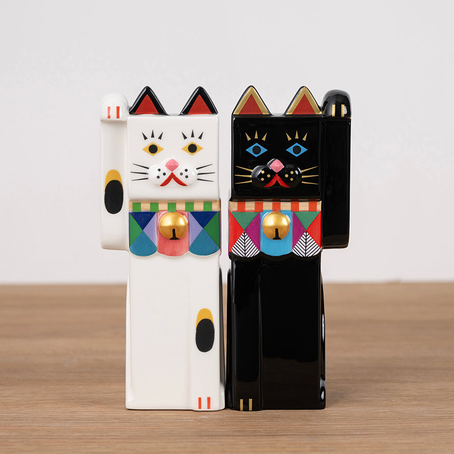そしてついに、コラボレーションの第二弾として、瀬戸の招き猫に挑戦することになりました。 招き猫ミュージアムを訪れて『古瀬戸型招き猫』を見た時、凛々しい顔つきとすらりとした猫背の姿がカッコ いいなと思い、今回はその特徴を活かして、より形をシャープにデザインしています。背中のラインや腕の付け方など、何度もやりとりを重ねました。 右手をあげている猫と左手をあげている猫の2匹を並べると、ぴたっと寄り添うのが特徴です。 『あなたの毎日にそっと寄り添って、福を招いてくれますように。』という願いを込めています。