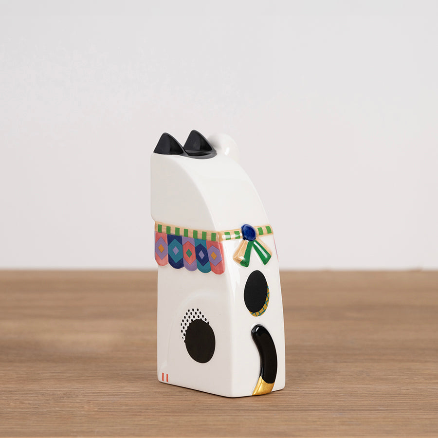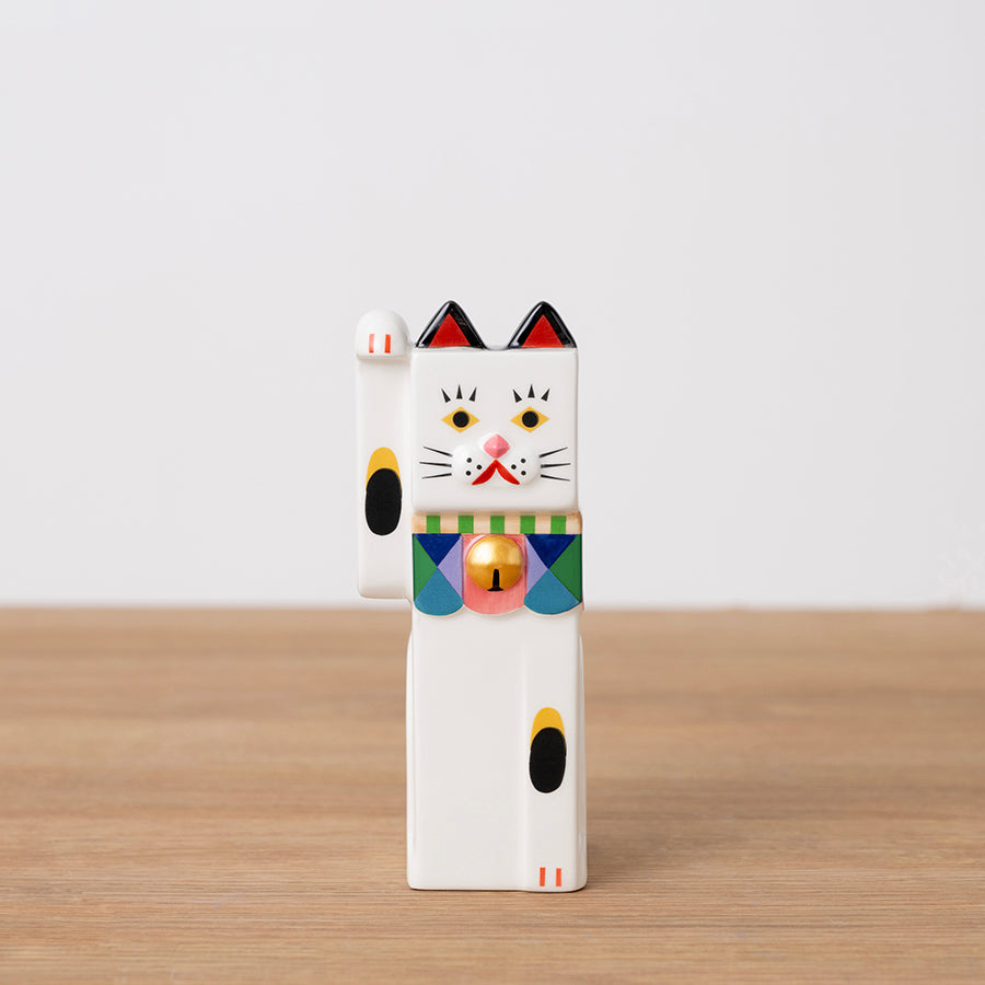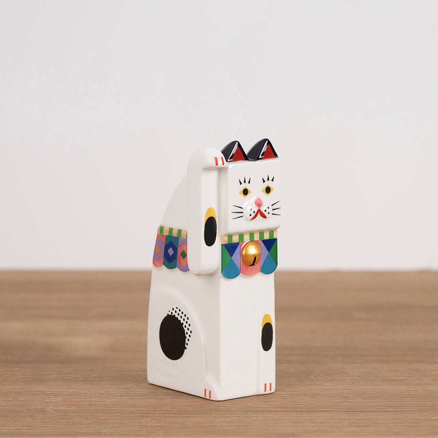 そしてついに、コラボレーションの第二弾として、瀬戸の招き猫に挑戦することになりました。 招き猫ミュージアムを訪れて『古瀬戸型招き猫』を見た時、凛々しい顔つきとすらりとした猫背の姿がカッコ いいなと思い、今回はその特徴を活かして、より形をシャープにデザインしています。背中のラインや腕の付け方など、何度もやりとりを重ねました。 右手をあげている猫と左手をあげている猫の2匹を並べると、ぴたっと寄り添うのが特徴です。 『あなたの毎日にそっと寄り添って、福を招いてくれますように。』という願いを込めています。