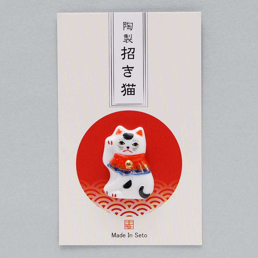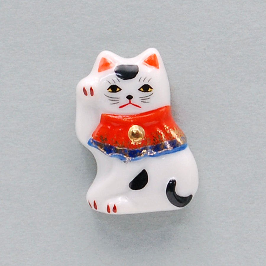 江戸の昔より招き猫は、お金や人を招いてくれる縁起物として広く庶民に親しまれてきました。 右手上げは「お金」を招き、左手上げは「お客」を招きます。100年前、日本で最初に招き猫作りが始まったやきものの街・瀬戸の技で、ピンブローチを製作いたしました。