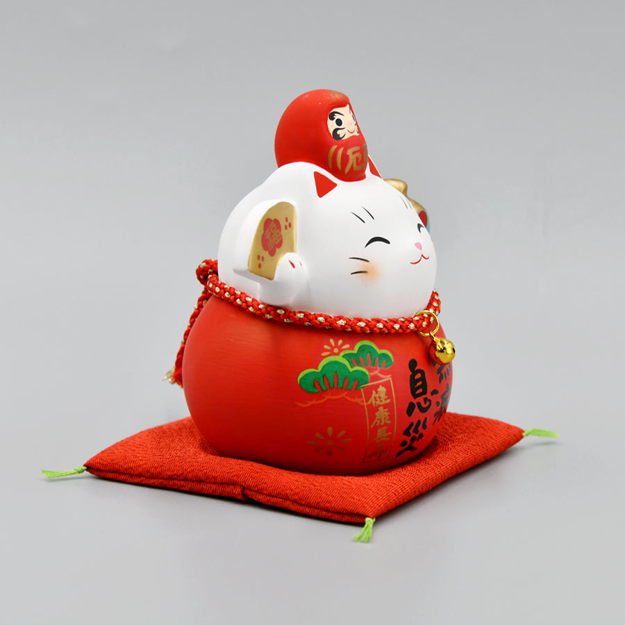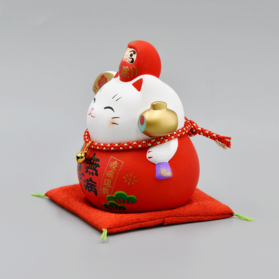 「だるま」と称してはいるものの、だるまになりきれず、ひょうたんの形をしたユニークな招き猫です。縁起物として親しまれてきただるまの「七転び八起き」「不撓不屈」の精神はそのままに、さらなる福を招こうと小さな手を懸命に掲げています。それを応援するかのように、招き猫の頭の上には小さなだるまがちょこんと鎮座し、なんとも縁起のよい招き猫になっています。試験などの合格祈願などに贈ったら、きっと喜ばれることでしょう。
