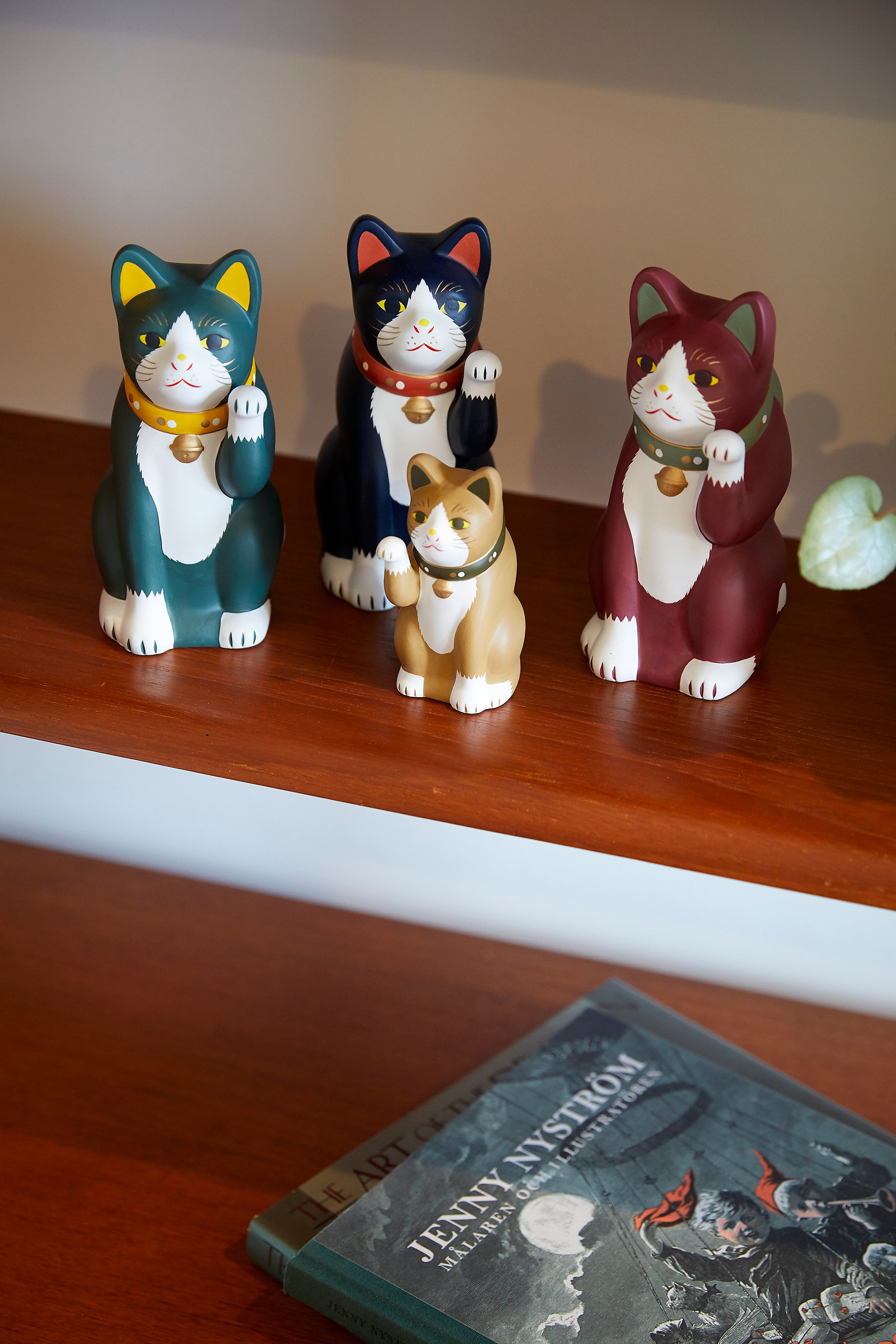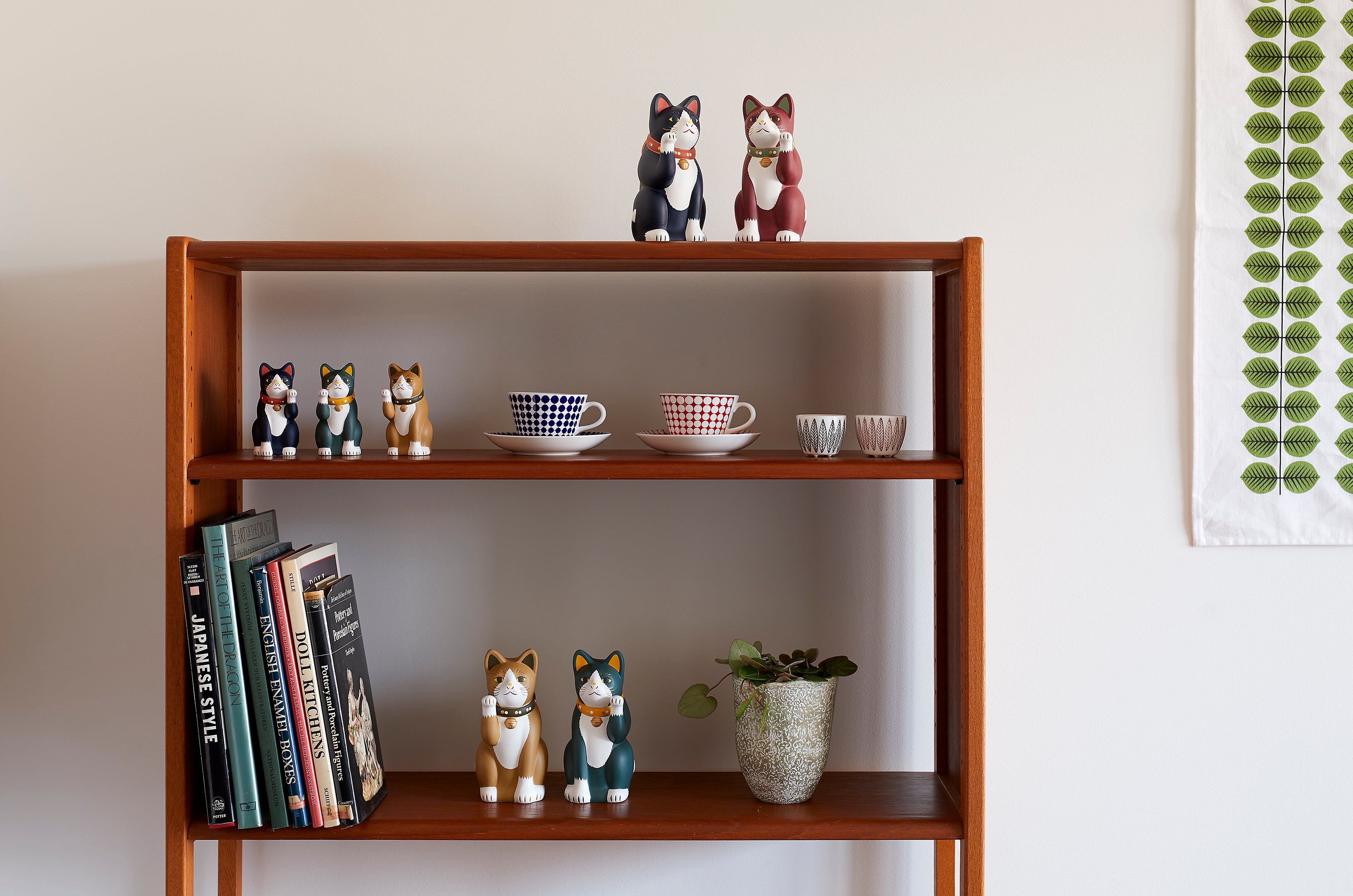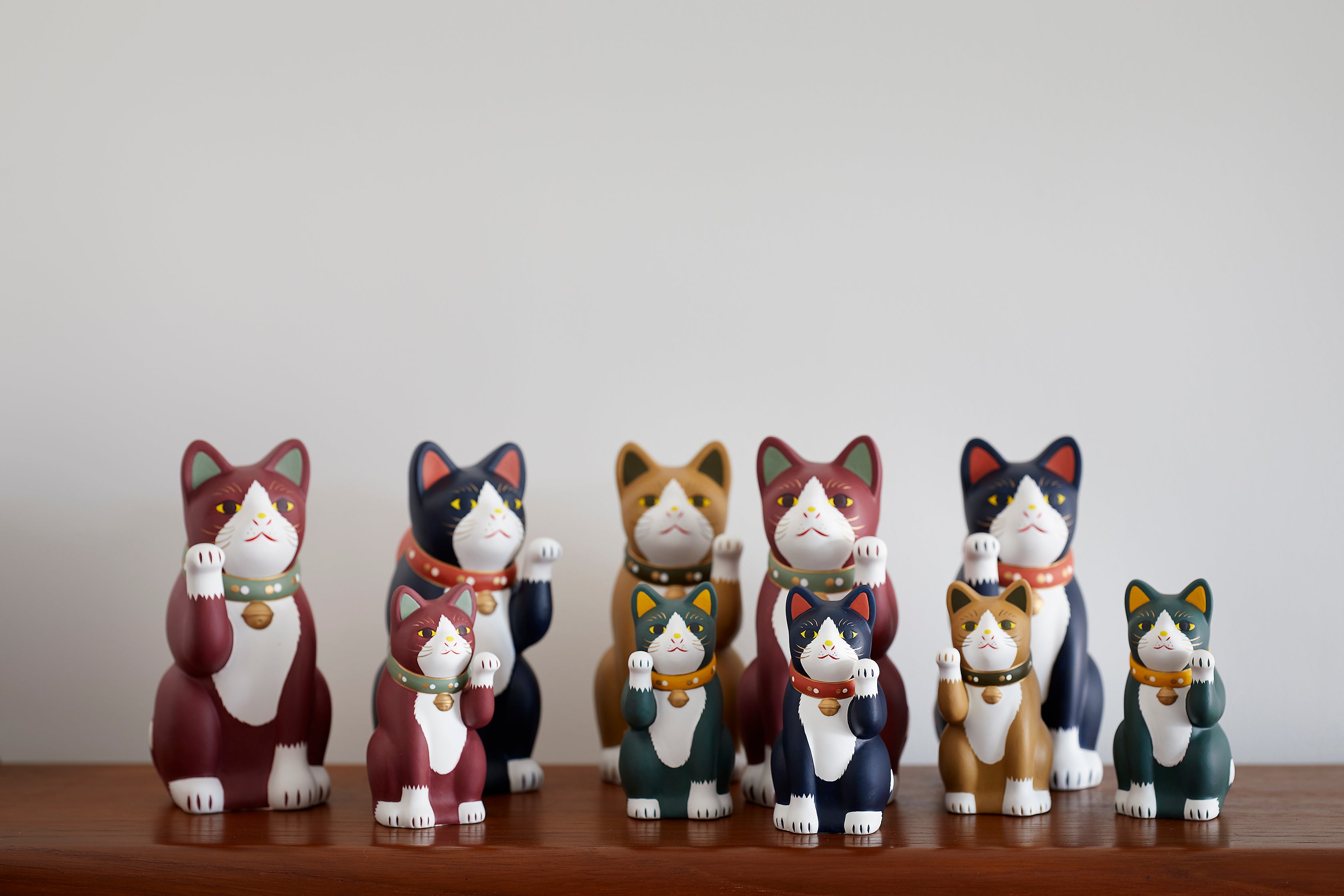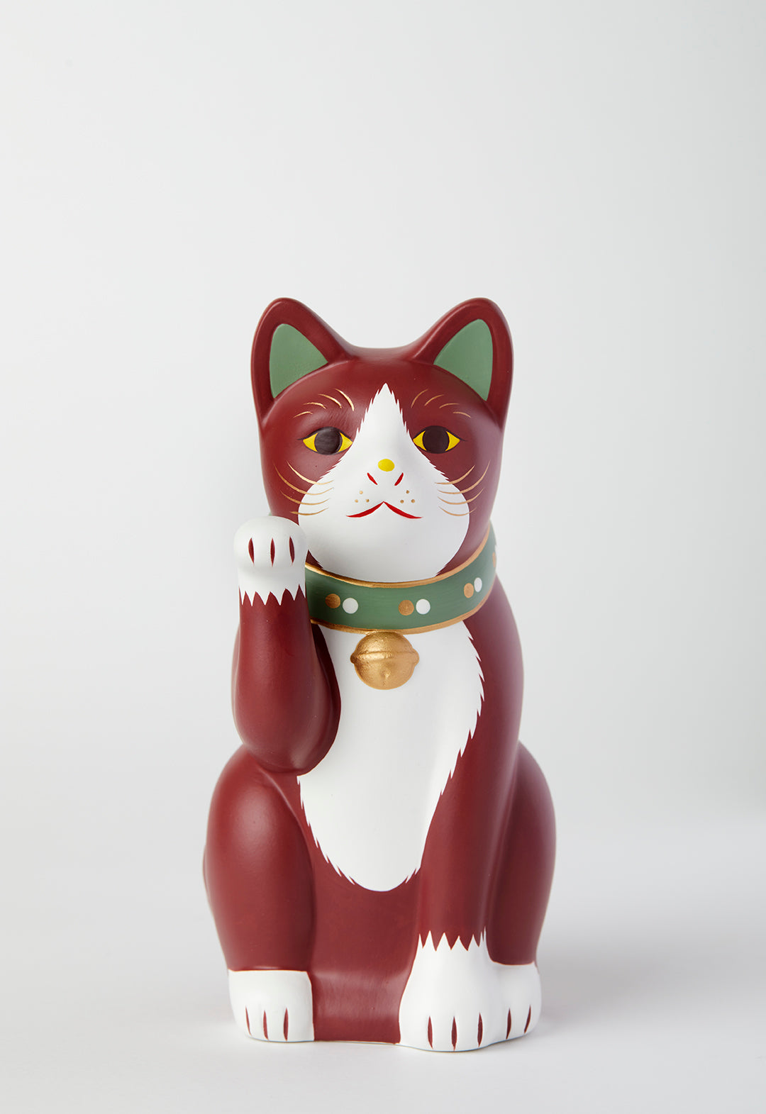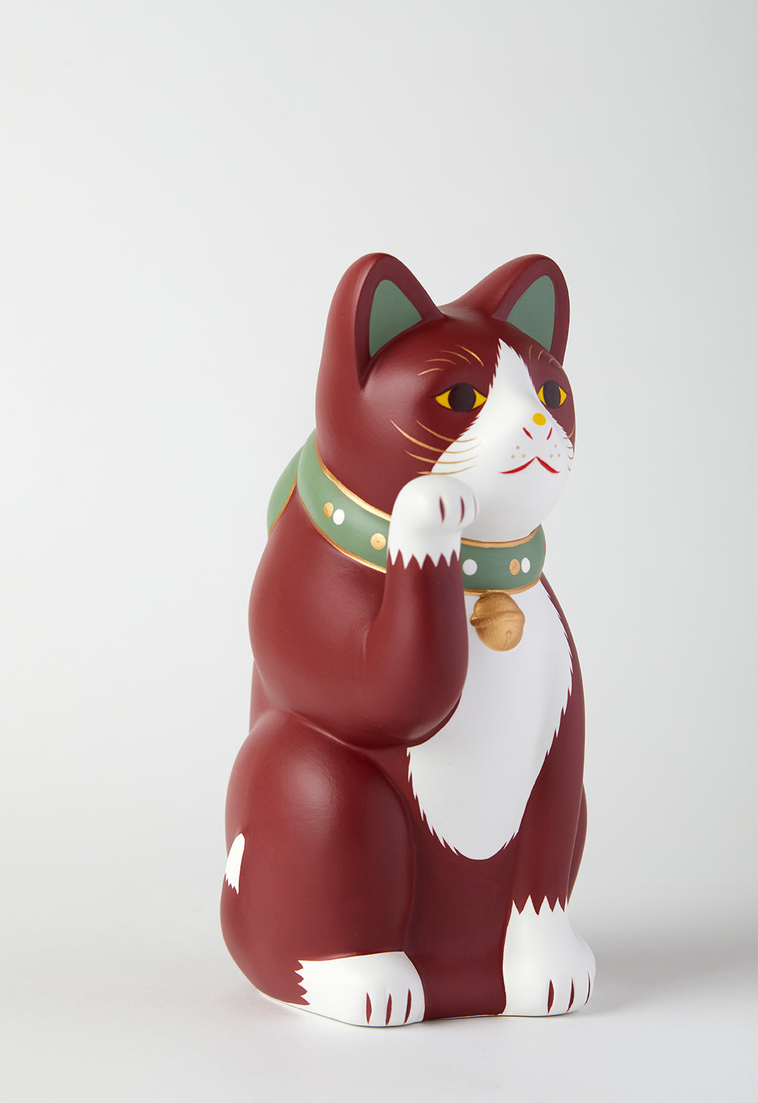 ヨーロッパの色調を意識したボルドー、オリーブ、ベージュ、ネイビーを纏った、招き猫としては珍しい色使いが特徴です。愛らしさとモダンさを兼ね備えた「瀬戸まねき猫」は、大人テイストのインテリアにもしっくりと馴染みます。