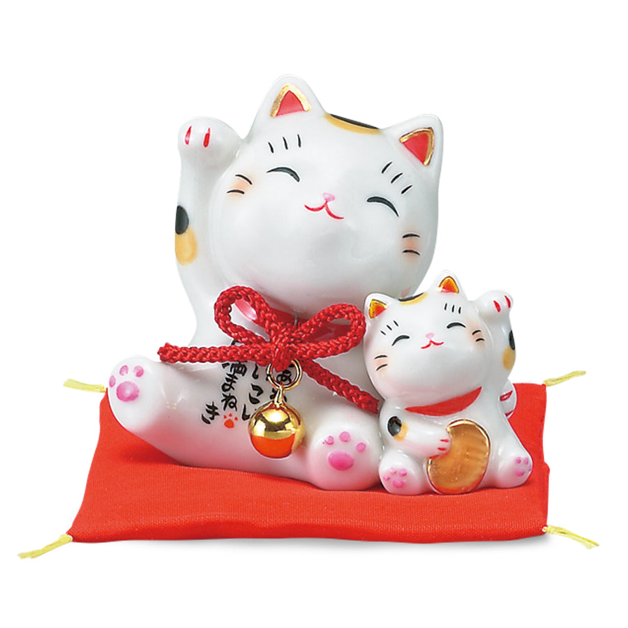 両手を掲げながらニコニコと笑顔の招き猫。その周りにはかわいらしいチビ猫たちが寄り添い、幸せな雰囲気を纏っています。この「円満招き猫」は、猫好きファミリーのお祝いごとに贈ってほしいという思いから生まれました。猫好きのご家族にさらなる福を招く縁起物として、出産祝いやお子様の誕生日のお祝いなどにおすすめです。バリエーションも豊富に揃っていますので、皆さんのお気に入りの招き猫を贈ってください。