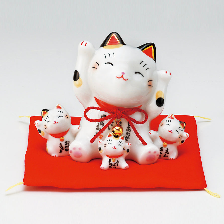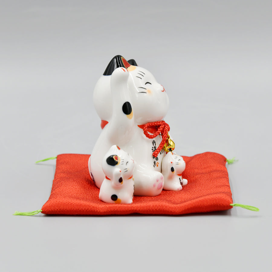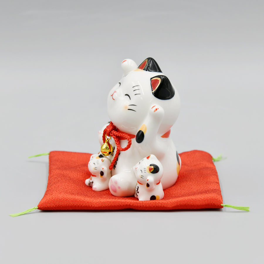 両手を掲げながらニコニコと笑顔の招き猫。その周りにはかわいらしいチビ猫たちが寄り添い、幸せな雰囲気を纏っています。この「円満招き猫」は、猫好きファミリーのお祝いごとに贈ってほしいという思いから生まれました。猫好きのご家族にさらなる福を招く縁起物として、出産祝いやお子様の誕生日のお祝いなどにおすすめです。バリエーションも豊富に揃っていますので、皆さんのお気に入りの招き猫を贈ってください。