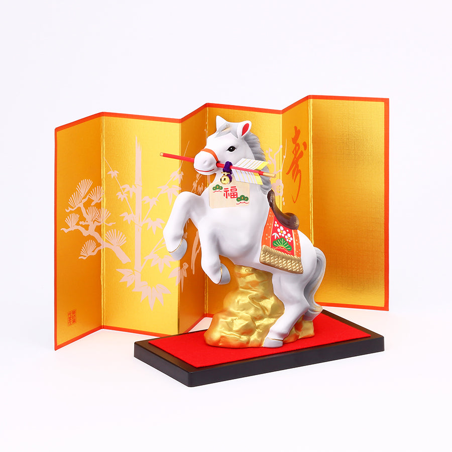 古来より午(馬)は生後すぐに走り出すことから、立身出世や幸運を招く動物として人々から尊ばれてきました。どんな道も恐れず駆け抜ける姿は、苦難を乗り越える力強さを感じさせ、発展と向上の1年となるようにとの願いが込められています。